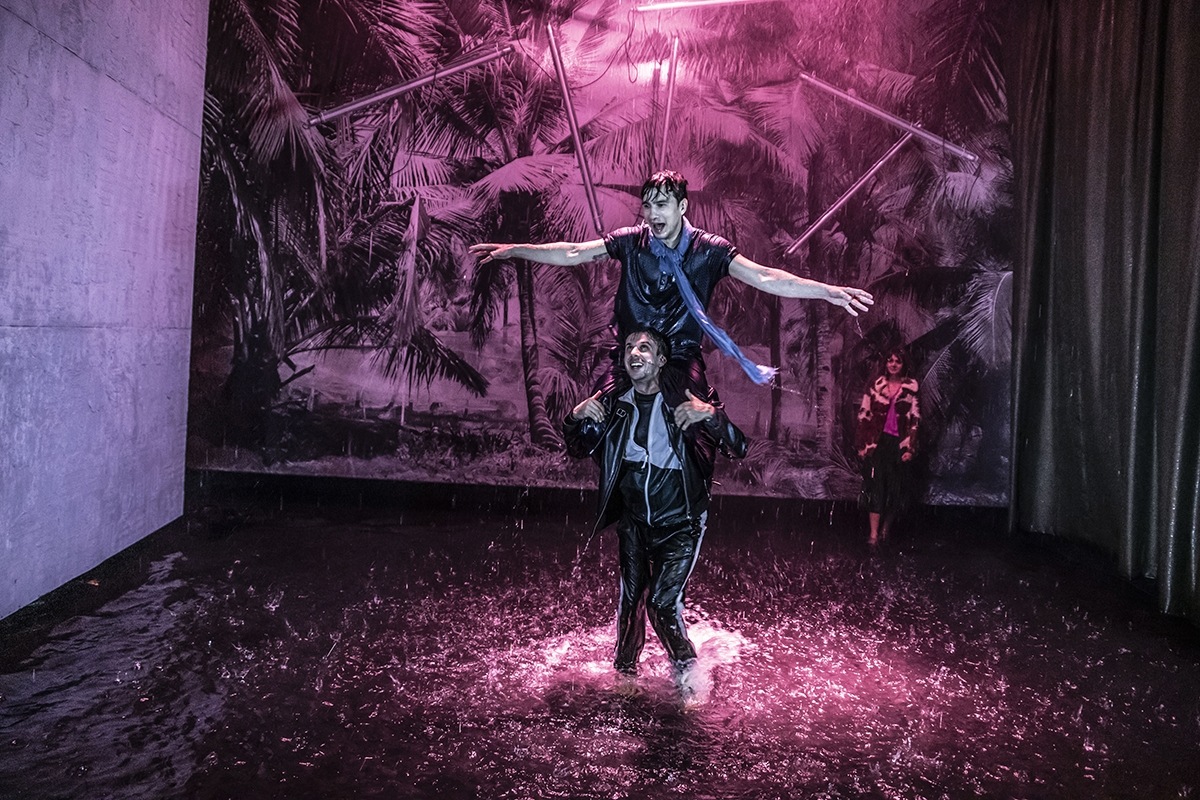 Gnieźnieński spektakl robi ogromne wrażenie – nie tylko przez dramatyczną i wstrząsającą linię narracji czy bardzo dobrą i przejmującą grę aktorską. Moim zdaniem najważniejszym elementem spektaklu jest scenografia. Ewelina Marciniak wraz z Grzegorzem Layerem wypełnili scenę Teatru Fredry wodą, w której aktorzy nie tylko cały czas brodzą, ale wielekroć się w niej zanurzają. Jedynym tłem wszystkich scen jest ściana, pokryta tapetą z palmami. Dodatkowo cały czas pada deszcz. Wydawałoby się, że woda to symbol oczyszczenia. Jednak w fascynującej inscenizacji Eweliny Marciniak lejące się strugi wody pochłaniają bohaterów – ona nie uwalnia od winy czy zarzutów, ona jest jak wszechogarniająca trauma, przed którą nie ma ucieczki. Jest symbolicznym i niezbędnym dopełnieniem każdej sceny. Jej ruch i wywoływane odgłosy to dodatkowa „muzyka” spektaklu. Aktorzy mając tak wyjątkowo niełatwe zadanie bycia partnerem nie tylko dla siebie, ale i dla tej paradoksalnie hipnotyzującej materii, w której są jakby zamknięci i nią też w jakiś sposób zdeterminowani, wywiązali się z niego bardzo dobrze. W rolę głównego bohatera wcielił się Piotr Nerlewski. Aktor prowadzi swoją postać bardzo subtelnie, delikatnie. Nie szafuje emocjami, a jednak doskonale widzimy, co przeżywa i jak pogrąża się w swoim dramacie. Jego siostrę gra Martyna Rozwadowska. Stworzona przez aktorkę postać może sprawiać wrażenie osoby dość prymitywnej i prostackiej. Ale Rozwadowska, korzystając niekiedy z elementów pastiszu czy nawet kabaretu, nigdy nie zapomina o tym jak ważne jest dobro i miłość do brata. Stara się być tolerancyjną i otwartą kobietą. Prawda jest jednak taka, że i ona nie do końca rozumie brata i nie umie mu pomóc, ale z całą pewnością darzy go siostrzaną miłością.