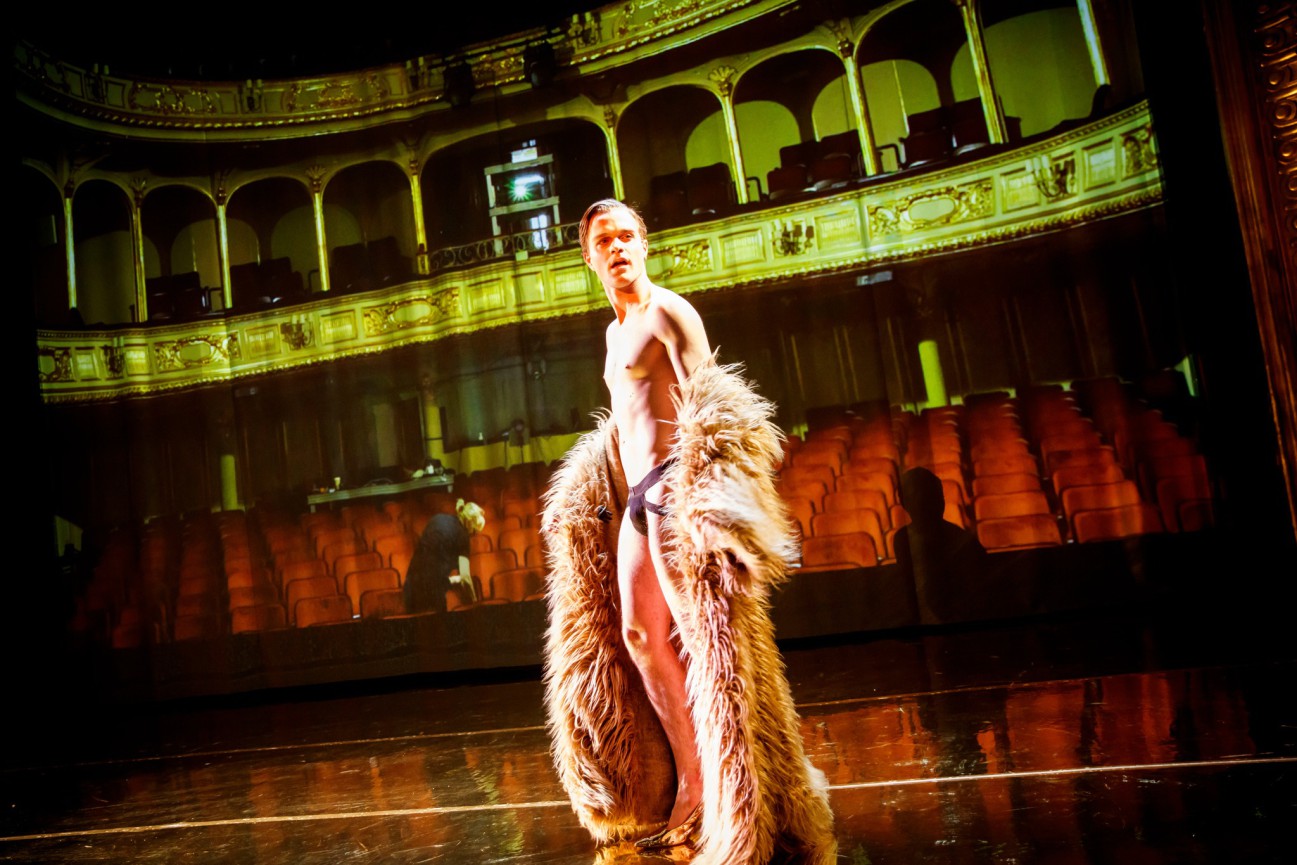 Michał Kotański konsekutywnie wykorzystuje modny ostatnio na toruńskiej scenie koncept planu scenicznego rozszerzonego o przestrzeń widowni, gdzie w lożach bocznych poznajemy Don Juana (Michał Darewski) i jego tchórzliwie-chciwego służącego Sganarel’a (Paweł Tchórzelski) oraz rozbieganą i zakochaną w głównym bohaterze Donę Elwirę (Maria Kierzkowska). By widz mógł za nimi nadążyć czy dosięgnąć wzrokiem z każdego miejsca widowni (podobnie jak w innych przedstawieniach Horzycy), ich sceny na wielki ekran transponuje na żywo operatorka kamery, Ewelina Miąsik.