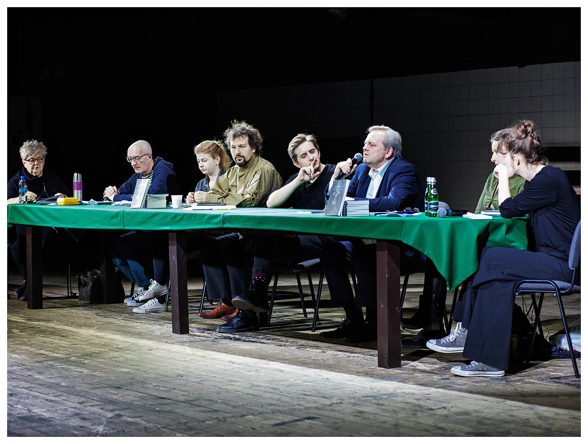 Kolejna, bardziej performatywna część spektaklu stanowi próbę wytworzenia metafizycznego doświadczenia i interakcji z widzami. Aktorzy zapraszają publiczność do wspólnego leżenia na scenie. I choć na pokazie w ramach opolskiego Maratonu Teatralnego, zaproszenie spotkało się z dość pokaźną odpowiedzią, to reszta, pozostającej na swoich miejscach widowni, zapewne wyczuła czający się pod tą propozycją fałsz. Pozorność budowania wspólnoty z widzem zostaje w spektaklu zdemaskowana bowiem już na samym początku, gdy Rafał Kronenberger pyta, ile osób przeżyło w ciągu ostatniego roku w teatrze katharsis. Aktor nie czeka na odpowiedź, zapewne nie dostrzega nawet siedzącej w ciemności widowni, rzuca fałszywą liczbę i oddaje się z powrotem swojemu wywodowi. Gdy więc w ostatniej części spektaklu – stypie po Grotowskim, ponownie zachęca się widzów do dołączenia do stołu i częstuje winem, trudno nie oprzeć się wrażeniu, że wszystko to powstało „na pokaz”, a widza, jak i samego Grotowskiego wykorzystuje się tu do prywatnej wypowiedzi na temat losów artysty. Losów smutnych, bo jak pokazuje scena swoistej sekcji zwłok, w której dokonuje się analizy zawartości kieszeni marynarki, nawet po wielkim artyście pozostają śmieszne i nieznaczące eksponaty – do połowy wypalona paczka ulubionych papierosów, niewyraźna notatka, nadgryziony orzech.