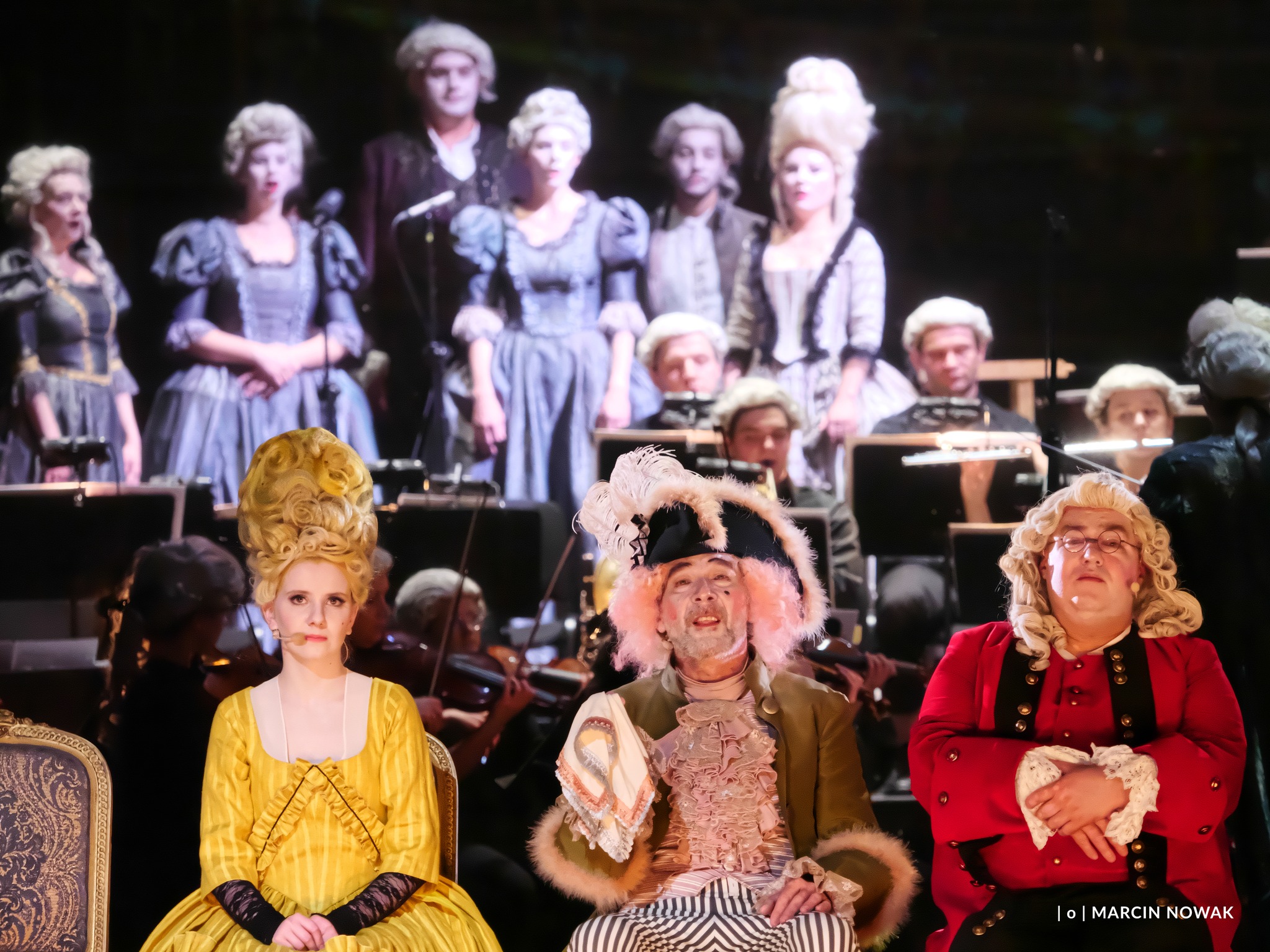 W pierwszej scenie spektaklu, stojąc u wrót śmierci (choć nie jest to takie pewne) Salieri – w tej roli Dariusz Bereski – opowiada historię swego życia. We wspomnieniach wraca do walki z rywalem i postanawia objaśnić dlaczego znany, zadowolony z życia, ceniony kompozytor będący u szczytu powodzenia postanowił zniszczyć Mozarta. Teraz nastąpi rozwinięcie, w którym najważniejsi są aktorzy, także ci drugoplanowi. Dzięki nim barwny obraz XVIII-wiecznego Wiednia spaja się z klimatem dworskich rozmów i intryg u boku cesarza Józefa. Epoka Mozarta lśni pełny blaskiem. W tytułowego Amadeusza wciela się młody aktor, Wiktor Piechowski (to już trzeci, po Krzysztofie Szczepaniaku i Marcinie Hycnarze Mozart w tej adaptacji). Gra całym sobą, każdym nerwem, czasem szaleje i niemal szarżuje. Jednak wie, kiedy się zatrzymać i w swym rozpędzie zachowuje konieczne granice. Zresztą ta rola wymaga brawury. Piechowski doskonale oddaje osobowość i stan ducha bohatera, który dla bliskich mu osób był człowiekiem wielkiego serca oraz entuzjastą życiowych radości. Zawistnicy widzieli w nim tylko prostaka, próżniaka czy hulakę. Aktor niespiesznie pokazuje przemiany bohatera, jego powolne popadanie w chorobę, depresyjny lęk. W pierwszej części dominuje farsowy styl i humor wraz młodzieńczą beztroską, natomiast w drugiej blednie infantylizm Mozarta, pojawia się przejmujący tragizm, dramat z bolesną świadomością osamotnienia i słabość umierającego człowieka. Salieri – narrator to słowa, monolog, dialogi. I nie ma w nim żadnej przesady, zadęcia. Dariusz Bereski gra ubieloną twarzą, odpowiednim gestem, wprawnym ruchem. Jego bohater przeżywa swoisty szok, gdy do Wiednia przybywa arogancki młodzik, obdarzony nadludzkim talentem. Geniusz muzyczny Mozarta nie ma przecież w sobie równych, a tego Salieri nie może ścierpieć. Bóg zakpił z najczystszych pragnień oddanego sługi! Dlatego musi stać się zaciekłym wrogiem Amadeusza. Bereski to inny Salieri niż jego poprzednicy – równie zgorzkniały i złośliwy, ale z powagą, smutkiem, poczuciem wyższości zmieszanym z małością i kompleksami. Pozostając częściej przerażającym niż zabawnym, aktor z wprawą, z techniczną biegłością tworzy swoją postać, wyraziście ukazując, co może dziać się w sercu upokorzonego człowieka. Barbara Garstka jako Konstancja Weber, żona Mozarta, jest zniuansowana, wdzięczna, urocza. Dramatyczna i komiczna, z wdziękiem bawi, ale i porusza. Pod koniec spektaklu, gdy przy dźwiękach „Lacrimosy” z Requiem żegna z płaczem ukochanego Wolfiego ma w sobie tyle tragizmu! W cesarza Józefa II, człowieka niemuzykalnego, lecz pretendującego do roli mecenasa artystów wciela się Karol Puciaty. Aktor przerysowuje trochę swego bohatera, jednak nie jest to zły trop, zwłaszcza że ubarwiony indywidualnym, ciepłym rysem. Oczywiście nie byłoby tego przedstawienia bez aktorów drugiego planu: Zbigniew Dziduch jako baron van Svieten jest wyborny, odpowiednio zdystansowany wobec wszelkich sytuacji, podobnie jak w warszawskiej wersji. Równie dobry pozostaje Paweł Tucholski – szambelan von Stack i Bogusław Suszka, czyli dyrektor opery Orsini Rosenberg. Venticellich, złośliwe, plotkarskie Wietrzyki, grają Radosław Osypiuk i Iwona Dróżdż. Niepoprawni żartownisie wyczuwają komediowy ton i swobodnie podążają za wskazówkami Anny Wieczur. Obaj mocno tkwią w świecie umownego teatru – tak miało być. Pozostali, nawet w mini rólkach, oddają w punkt reżyserski zamysł. Mirosław Henke jako Kappelmeister Bonno i dostojna Joanna Koc – Teresa Salieri warci są uwagi! Podobnie Katherina Cavalieri – wspaniała sopranistka, Wioleta Sędzik.