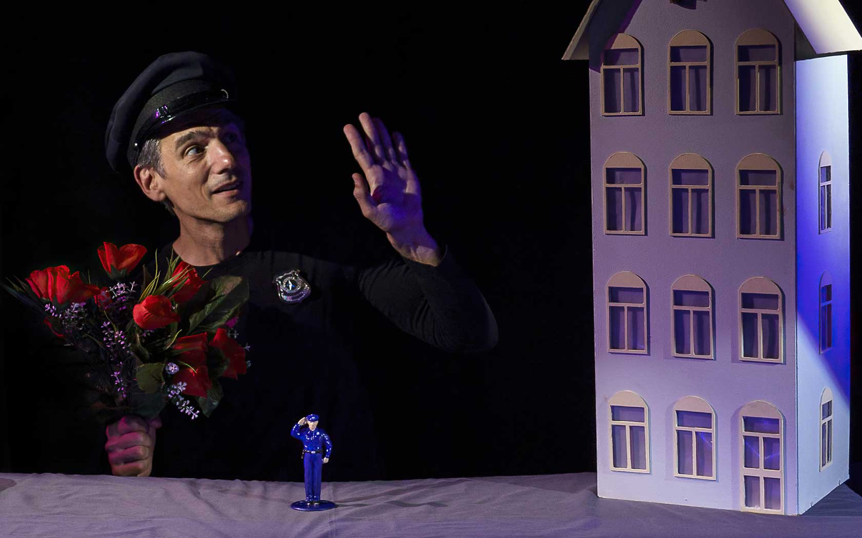 Thanos Sioris, jako jedyny performer, buduje całą opowieść przy pomocy lalek, masek i sugestywnej pantomimy. Jego ciało, ruch i głos stają się narzędziem, którym rzeźbi w przestrzeni nie tyle fabułę, co emocjonalną topografię współczesnego społeczeństwa – takiego, w którym mundur mówi więcej niż słowa, a pałka czy tarcza stają się symbolami czegoś znacznie głębszego niż tylko fizyczna siła.