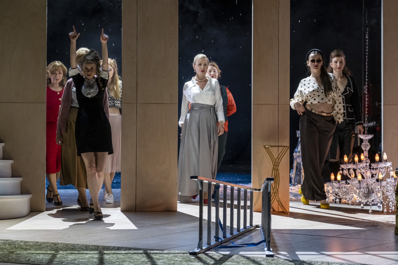 Sztukę Osiem kobiet francuskiego dramaturga Roberta Thomasa wystawianą od ponad sześćdziesięciu lat na wielu europejskich scenach (także w Toruniu w 1978 roku w reżyserii Marka Okopińskiego i Marka Milewskiego) cechuje niezwykła swoboda i lekkość w prowadzeniu dialogów między jego wielotorowo nakreślonymi charakterologicznie bohaterkami. Tkwiącymi w mikroświecie nieco dziś już sztucznym i passé, do tego w entourage wielopokoleniowej rodziny oraz żyjącej w wielkim domu na odludziu. Z panem domu, skrytym za drzwiami sypialni, jego wyniosłą żoną, Gaby (Agnieszka Wawrzkiewicz), dwoma córkami: Suzon (Julia Szczepańska) i Katarzyną (Ada Dec), hipochondryczną, siostrą Augustą (Maria Kierzkowska), przygasłą teściową, Starszą Panią (Jolanta Teska), gosposią, Chanel (Małgorzata Abramowicz) i wybuchową służącą, Luizą (Joanna Rozkosz).