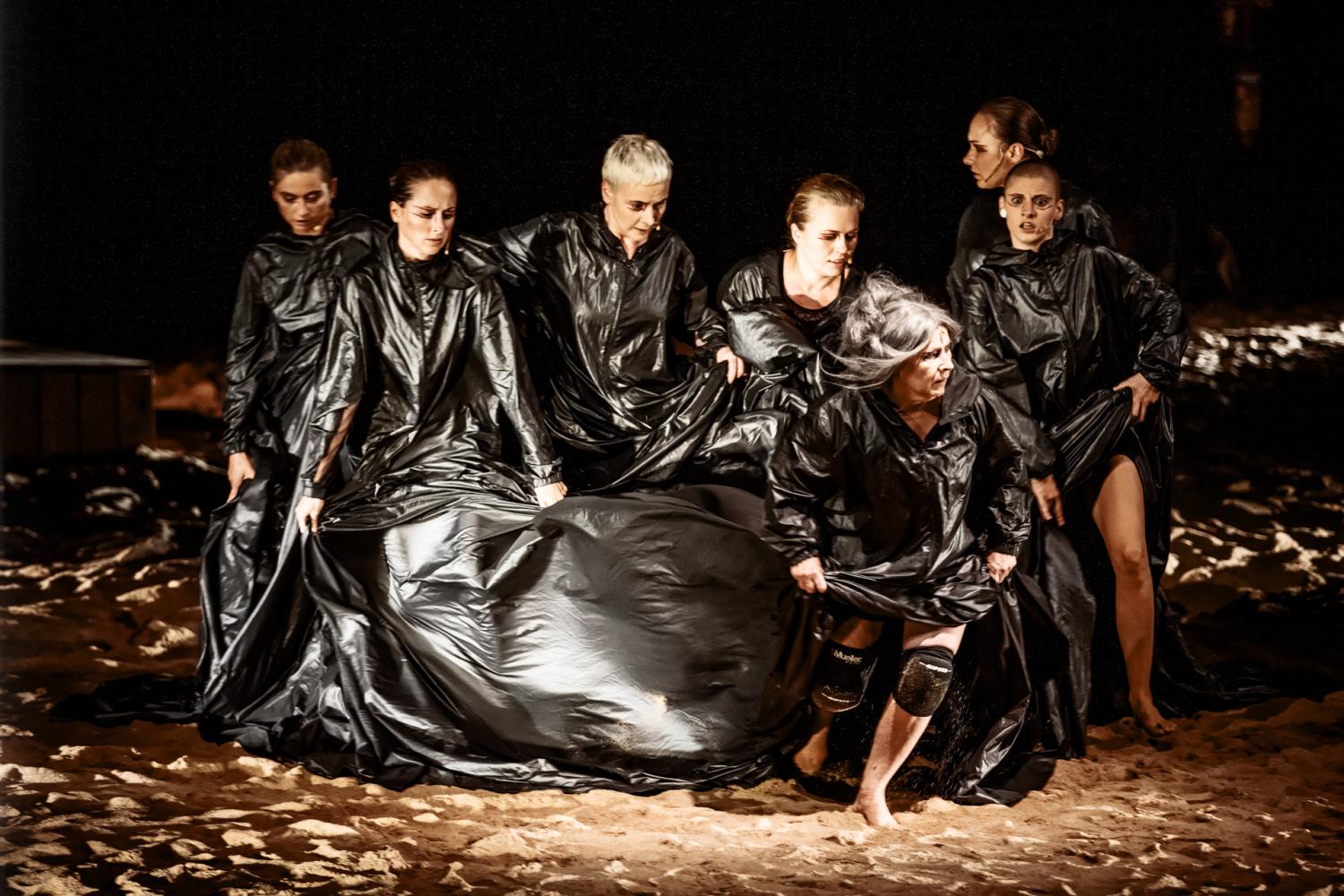 Skuty boleścią, pogrążony w smutku i w żałobie chór trojańskich kobiet, z jego kapłanką Hekabe na czele (rewelacyjna rola Doroty Kolak, z jednej strony pełna dostojności w próbach zachowania człowieczeństwa, z drugiej przepojona pragnieniem zemsty ponad wszystko) przedziera się przez pokrytą piaskiem przestrzeń sceny, spowity w jeden wielki całun czarnego kokonu. Jest w tych kobietach cały tragizm sytuacji po utracie najbliższych, a także wobec tego, co próbuje im zgotować bezceremonialność wojennych triumfatorów. Akanta (Magdalena Boć), Enyo (Agata Bykowska), Sophia (Małgorzata Brajner) i Andromacha (Katarzyna Dałek), razem ze swoją przewodniczką, „zawinięte” w jedną tkaninę, wykonują szereg rytualnych gestów i działań, które raz ulegają spowolnieniu, to znów nagle przyśpieszają, by po chwili zamienić się w odrętwiający bezruch – świetna robota Maćko Prusaka. Jest w tym gniew i szaleństwo, ale też i skarga, ogromna doza bezsilności wobec poniesionej klęski, jest jednocześnie uporczywość i niewzruszoność działania, jest niepokorność, zawziętość i niezłomność. Ta intensywność emocji jest jak uporczywie powracający ocean trudnego do wypowiedzenia bólu i rozpaczy. One wiedzą, że ich bycie w jedności wzmaga ich lament i siłę każdego wspomnienia poniesionej straty – że Troja, mimo cierpienia, dzięki nim wciąż jeszcze trwa – choć w śmiertelnym uścisku. Trzeba powiedzieć, że wszystkie aktorki potrafiły znakomicie odnaleźć się w balansie między dostojnością a upokorzeniem, potrafiły też pięknie indywidualizować zachowania wobec stawania pod pręgierzem śmierci czy więzienia, każda tworząc odmienny, dźwiękowy wariant kobiecych zachowań.