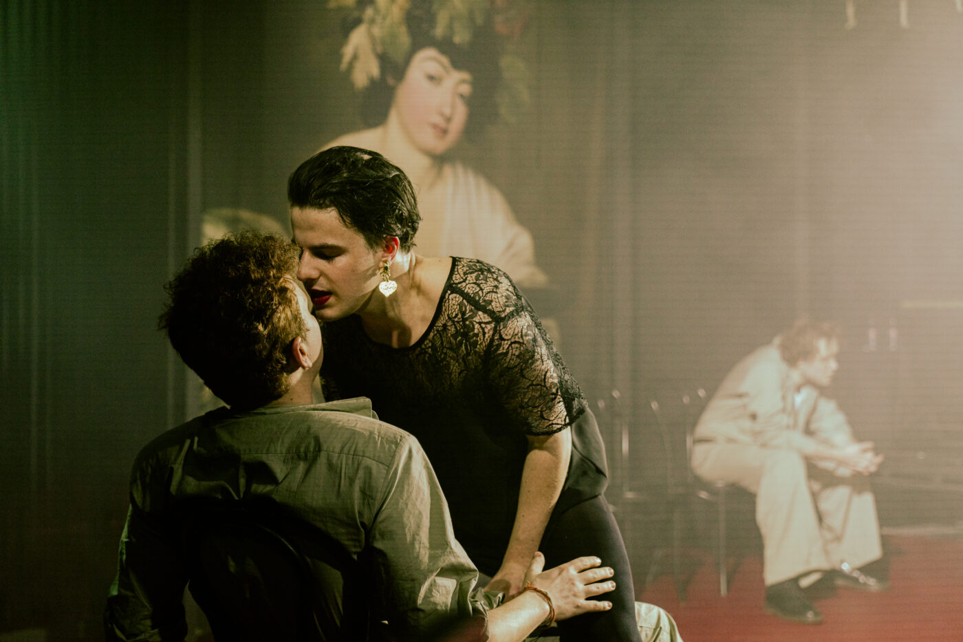 Spektakl rozpoczyna imprezowa rozmowa Adama z Dominikiem o miłości. Dzielą się doświadczeniami, spostrzeżeniami i pragnieniami. Maćka poznajemy dopiero w następnej scenie, w której błyszczy (i to dosłownie!) i stepuje (choreografia: Agnieszka Barańska). Scenografia Katarzyny Warnke i Magdaleny Kanik “chowa się” pod sufitem, żeby zrobić miejsce na to interesujące show.