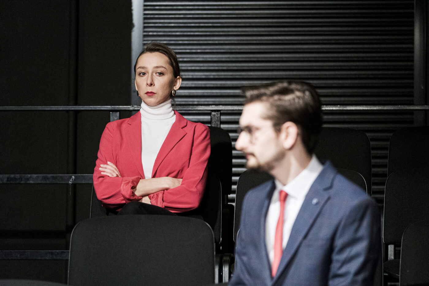 Magdalena Kekenmeister w roli milczącej, pozornie opanowanej, zdystansowanej bizneswoman (specjalistki od ryzykownych operacji giełdowych) jest świetna. W pamięć zapada jej woskowa, pozbawiona mimiki twarz. I krótkie wypowiedzi – mocne jak brzytwa. Kiedy włącza płytę The Doors, by przy dźwiękach „The End” snuć swą wyimaginowaną opowieść (z lekkością, uśmiechem Sfinksa), widzowie zastygają. Takie precyzyjne aktorstwo warto docenić! Kamila Najduk jako wprawna, w pełni profesjonalna, prowadząca spotkania doradczyni personalna pozostaje delikatna, elegancka i przyjazna – do czasu. Aktorka trafnie oddaje przemianę bohaterki – kiedy w końcu zrzuca maskę, jej poruszające wyznania i ból wcale nie wydają się przesadzone. Towarzyszy jej Weronika Kozakowska, również w roli fachowca z NCC – opanowana, stanowcza i pewna swej terapeutycznej wiedzy kobieta sukcesu prowadzi całą grupę wsparcia przez dziwne „gry”. W pewnym momencie, podobnie jak pozostali uczestnicy autoterapii decyduje się na szczerość i traci pozornie niezachwianą pewność siebie, kurczy się wewnętrznie. Maciej Żmijewski gra najkrótszego stażem, bezrobotnego, całkowicie oddanego firmie i chorobliwie zaprzeczającego prawdzie pracoholika. Aktorowi udaje się pokazać emocje zdegradowanego kierownika, który żyje przeszłością, dawnym prestiżem, wspomnieniami poświęcenia, z jakim przeprowadził generalną reorganizację cateringu w Swissair. Ale jego też dopadł drapieżny kapitalizm. W scenie rozmowy z żoną – bardzo dobra Waleria Gorobets – odkrywa kulisy życia prywatnego „top dogs”. Dzięki temu możemy przyjrzeć się pokrętnym, toksycznym relacjom rodzinnym, które przykryte są pozorami i fałszem. Kolejny top menedżer bez skrupułów opisuje biznes jako krwawą wojnę. Michał Zieliński gra mocno, ale bez szarżowania, co jest niezwykle cenne w tak angażujących emocje scenach. Pokazuje bunt i rezygnację bohatera, poczucie bezsilności i upokorzenia, a jednak nie przestaje uczestniczyć w proponowanym, praktycznym treningu adaptacyjnym, choć często jego sens wydaje się wątpliwy. Robert Czerwiński, trener tenisa (najlepszy!) w opowieściach o zamianie luksusowego Volkswagena Golfa GTI na Porsche 911 zawarł całą swą frustrację, gorzką i prawdziwą, choć może trudną do zrozumienia. Paweł Gasztold-Wierzbicki jako hipochondryczny, nie panujący nad sobą były menedżer projektu w wiodącej na rynku firmie związanej z produkcją turbin wiatrowych, w scenach płaczu i nadmiernej szczerości staje się nieco irytujący. Jednak nie ma tu żadnej przypadkowości, cała kreacja aktorska jest dopracowana i przemyślana. I może właśnie jego postać najmniej karmi się hipokryzją, dobitnie pokazując siłę, z jaką wspomniana degradacja rujnuje całe dotychczasowe życie najlepszych, prowadząc do fizycznego i psychicznego załamania. Ostatecznie wszyscy bohaterowie, niedawni ludzie sukcesu, zostają odarci ze złudzeń i kłamstw, a ich dumę i brawurę zastępuje wyobcowanie, poczucie straty, utraty godności i przerażająca samotność. Wciąż zapatrzeni w brutalny świat wielkiego biznesu, próbują poradzić sobie ze stratą, traumą i szeroko pojętą zmianą.