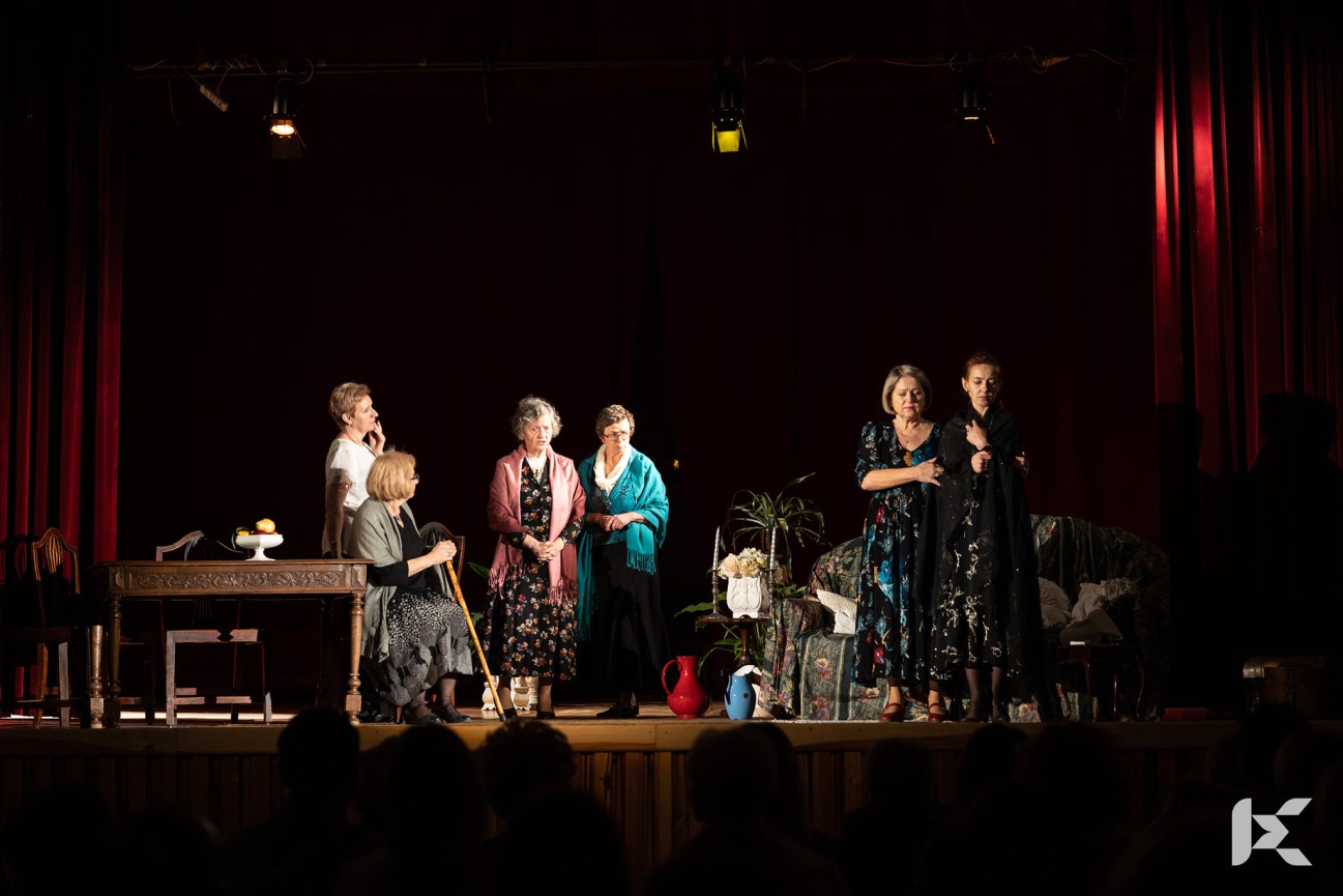 Ponad dwa lata temu ta sama instruktorka, z tym samym prawie zespołem aktorskim, zrealizowała sztukę Roberta Thomasa „8 kobiet”. W sztuce Nałkowskiej kobiet jest też osiem, przy czym dramat właściwy dotyczy sześciu z nich. Wszystkie panie mieszkają w wiejskim domu wiekowej wdowy, Celiny Bełskiej. Julia Czerwieńska i Maria Łanowa to jej córki, Joanna Nielewiczowa i Róża Byleńska to wnuczki Celiny, a córki Marii. Jest też synowa nestorki, Tekla Bełska (gra ją bardzo wiarygodnie Ewa Gawlik). Wszystkie – poza rozwódką Różą (Jagoda Dadia) – to wdowy. Najkrócej, bo dopiero od czterech miesięcy, we wdowieństwie znajduje się Joanna i to jej trauma wydaje się najmocniej odczuwalna. Panie żyją sobie w miarę spokojnie i dostatnio (mają nawet służącą, Zofię Sworzeniową – w tej roli Bożena Gniazdowska, którą chciałoby się zobaczyć w większej, charakterystycznej roli), zarobkowo nie pracują, bo o ich materialne bezpieczeństwo dbali ich zmarli lub byli mężowie, dla których żyły i dzięki którym egzystowały. Panie rozpamiętują przeszłość i każda z nich próbuje jakoś okiełznać sytuację, w której się znalazła. Julia (po kobiecemu rozkoszna Bożena Krajewska) stara się zachować pogodę ducha i zachwyt nad otaczającą ją naturą, przejmując się chyba tylko swoimi problemami gastrycznymi; Maria ucieka w codzienną krzątaninę, opiekę nad innymi i chronienie starszej córki (znakomicie to rozdarcie bohaterki pokazuje Alicja Major–Salwierz); Tekla usiłuje racjonalizować całą sytuację, patrzeć na nią z dystansem, bo przecież mogło być gorzej… Pola do popisu (czytaj: rekonstrukcji swojej egzystencji) nie mają jednak zbyt wielkiego, gdyż poza brakami formalnymi, takimi jak choćby wykształcenie czy doświadczenie zawodowe, nie posiadają również umiejętności i chęci walki o swoje.