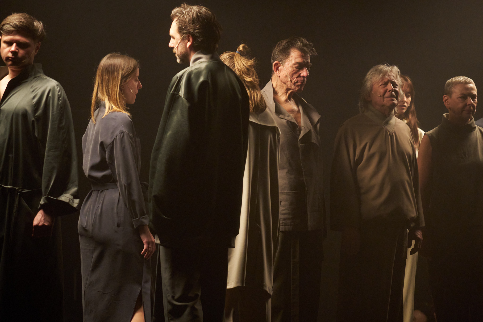 Nie ma tu klasycznej akcji, nie ma relacji ani osi dramaturgicznej. Zamiast tego fragmenty wspomnień i myśli. W wykonaniu zespołu TR Warszawa (Jan Dravnel, Izabella Dudziak, Monika Frajczyk, Mateusz Górski, Magdalena Kuta, Lech Łotocki, Sebastian Pawlak, Tomasz Tyndyk, Justyna Wasilewska, Mirosław Zbrojewicz) głosy zyskują wyrazistą, choć nieprzesadną obecność. Aktorzy nie grają, nie udają, nie ilustrują. Po prostu są – w tekście, w rytmie i w oszczędnie przygotowanej przestrzeni. Trzy wielkie reflektory podążają za nimi i ruchem obrotowej sceny, która podtrzymuje wrażenie dryfowania.