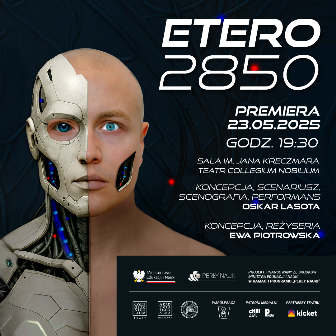 Zapraszamy na premierę Performansu ETERO2850, która odbędzie się 23.05.2025r. o godz. 19.30 w Teatrze Collegium Nobilium w Akademii Teatralnej im. A. Zelwerowicza w Warszawie. Działanie performatywne podsumowujące projekt badawczy realizowany w ramach programu Ministra Edukacji i Nauki pod nazwą „Perły Nauki”.