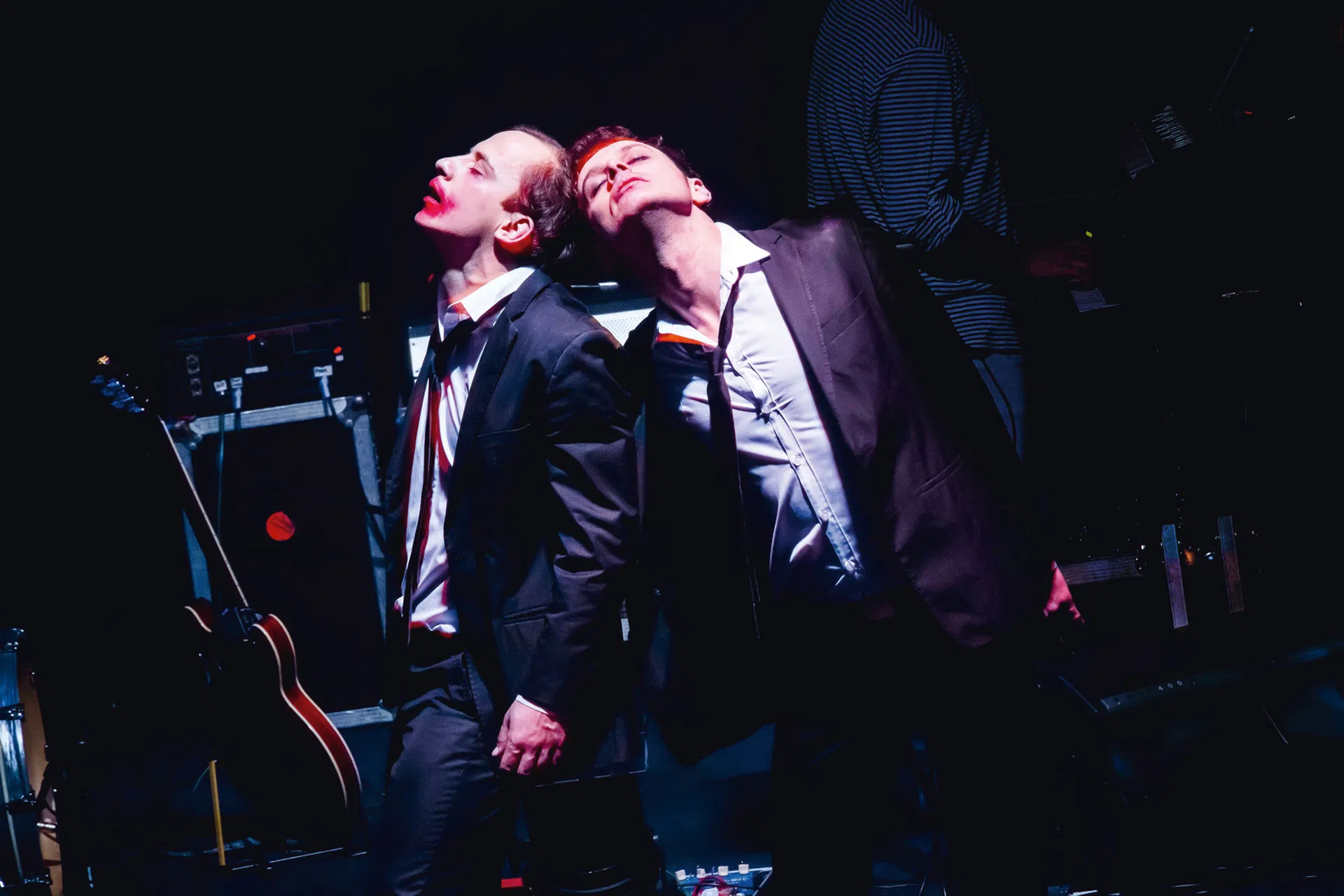 Napięcie seksualne, jakie wytwarza się pomiędzy nimi jest doprowadzoną do ekstremum metaforą wszystkich relacji międzyludzkich, wszystkich połączeń i zależności, ofert zaspokojenia i propozycji dania się zaspokoić. Budzą się uśpione żądze, nieznoszące półcieni, półtonów i światła dziennego. Pod garniturem, pod pozorem normalności czyha żywioł. Wymienione spojrzenia to spotkanie. Paniczna potrzeba bycia zobaczonym, nie tylko przez drugiego mężczyznę, ale też przez publiczność teatralną sprawia, że istnienie postaci na scenie staje się konkurencją. Ta rozpaczliwie werbalna szarpanina zakrawa o ekshibicjonizm. Szarmanccy panowie chcą kupić przychylność publiczności za wszelką cenę, popisują się, gotowi przekraczać swoje granice.