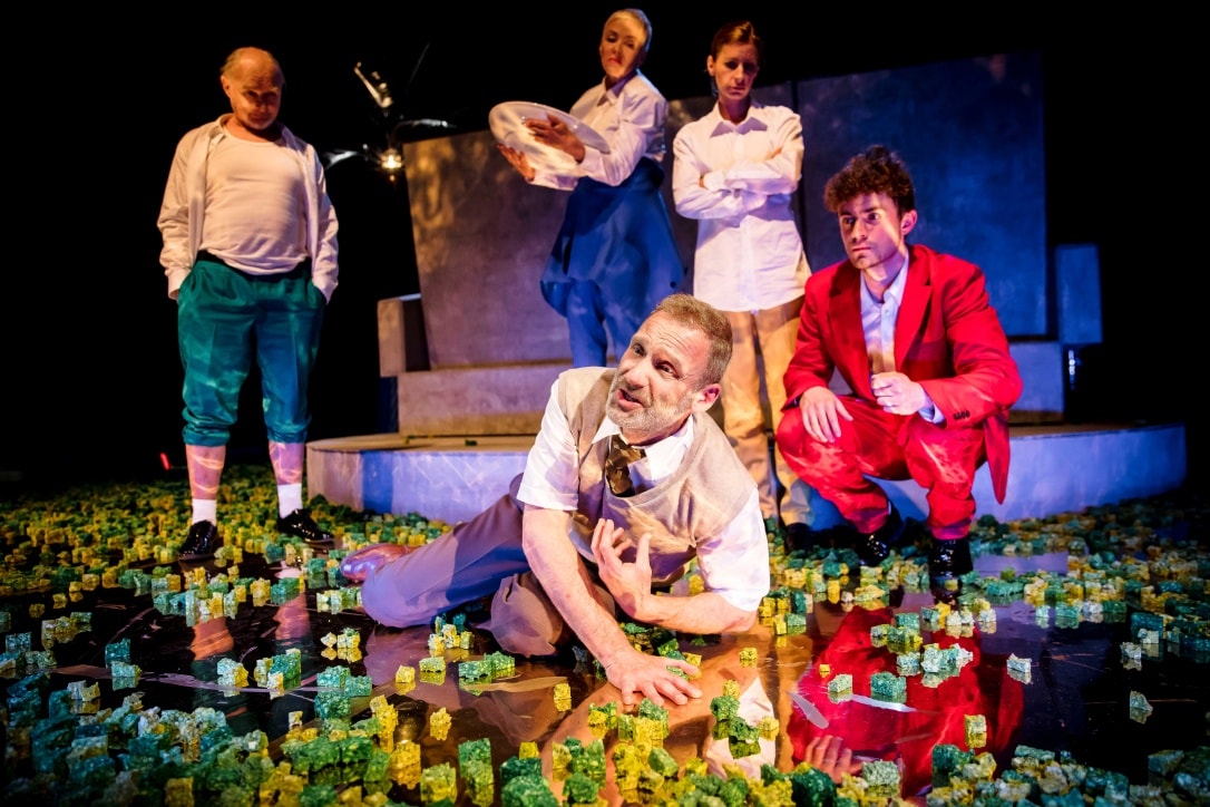 Od pierwszej sceny widzimy wszystkich – Adama Cywkę (Adaś), Ewę Telegę, Jakuba Pruskiego (zamiennie z Jakubem Sasakiem), Magdalenę Schejbal, Milenę Suszyńską, Janusza Łagodzińskiego – a jak ktoś znika, to tylko na chwilę, by po kilku minutach wrócić z kolejnym szaleństwem. Aktorzy ubrani w różnokolorowe garnitury są z jednej strony rozmaitymi postaciami, które przewijają się w życiu Adasia, ale też jego wewnętrznymi głosami. W kwestii obsadowej mam jeden zarzut – żałuję, że reżyser nie pobawił się trochę główną postacią. Dosłownego Miauczyńskiego już mamy. Może 2022 roku to dobry moment, żeby zagrał go ktoś, kto wyglądem, stylem, sposobem mówienia i bycia, a może nawet przymiotami płciowymi nadałby tej postaci dodatkowy rys?