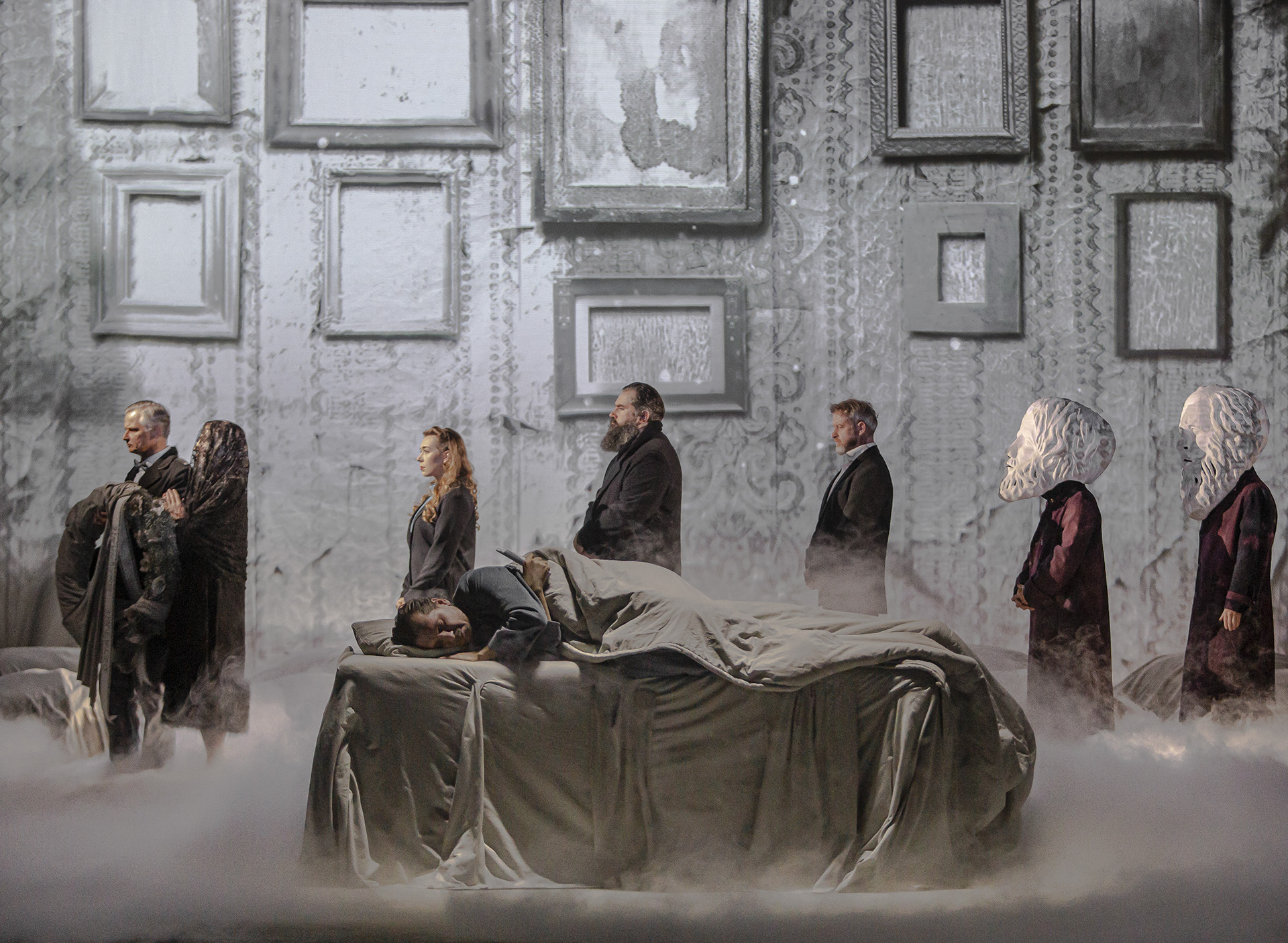 Paweł Szkotak wymyślił postać Bohatera, który jest człowiekiem straumatyzowanym, psychicznie roztrzaskanym i ma problemy z podejmowaniem własnych decyzji. Takie podejście wydaje się być bliskie  dzisiejszemu odbiorcy. U protagonisty dostrzegamy jakiś syndrom wypalenia. On się ciągle próbuje ze sobą rozliczać, prowadzi wewnętrzny rozrachunek, ma depresję. Bohater – postać o wielu imionach, ubrana w bladoniebieski uniform (równie dobrze może on symbolizować garnitur czy piżamę), osadzona w centrum sceny na łóżku/katafalku  – siedzi, leży i tak naprawdę nie robi nic…   Jego stany psychiczne kojarzyć się mogą z ogarniającą nas wciąż pandemią. Spotyka różne postacie przewijające się w jego życiu. Są one zamazane, lekko zakurzone, oniryczne, jakby przejściowe. Próbują go skłaniać do rozmowy, do wspomnień, do podejmowania decyzji i do działania. Bohater, choć ułomnie, próbuje uniknąć tego, do czego jest prowokowany, musi jednak wraz z pozostałymi poddać się tej ostatniej spowiedzi, która jest niczym rytuał oparty na ludowej obrzędowości związanej z jego pożegnaniem. Przemysława Chojęta zbudował postać Bohatera jako człowieka wrażliwego, delikatnego, nienachalnego i mocno wycofanego. Miałam wrażenie, że aktor gra wewnętrzną ciszą i było to w jego interpretacji bardzo sugestywne i przejmujące.