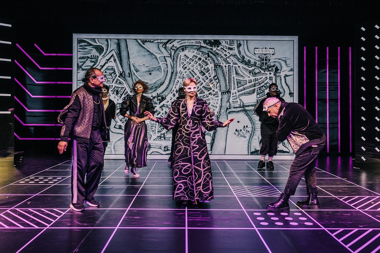 Warto się zatrzymać także przy kostiumach Zuzanny Markiewicz – z pozoru całkiem oderwanych od konwencji teatru elżbietańskiego, w rzeczywistości przemyślanych. Dresy, adidasy, złote łańcuchy – to elementy stylizacji, które zderzają średniowieczną Weronę z estetyką współczesnej ulicy. Efekt? Oba rody wyglądają jak mafijne klany lub szemrani przedsiębiorcy. W tej interpretacji miłość staje się walutą przetargową.