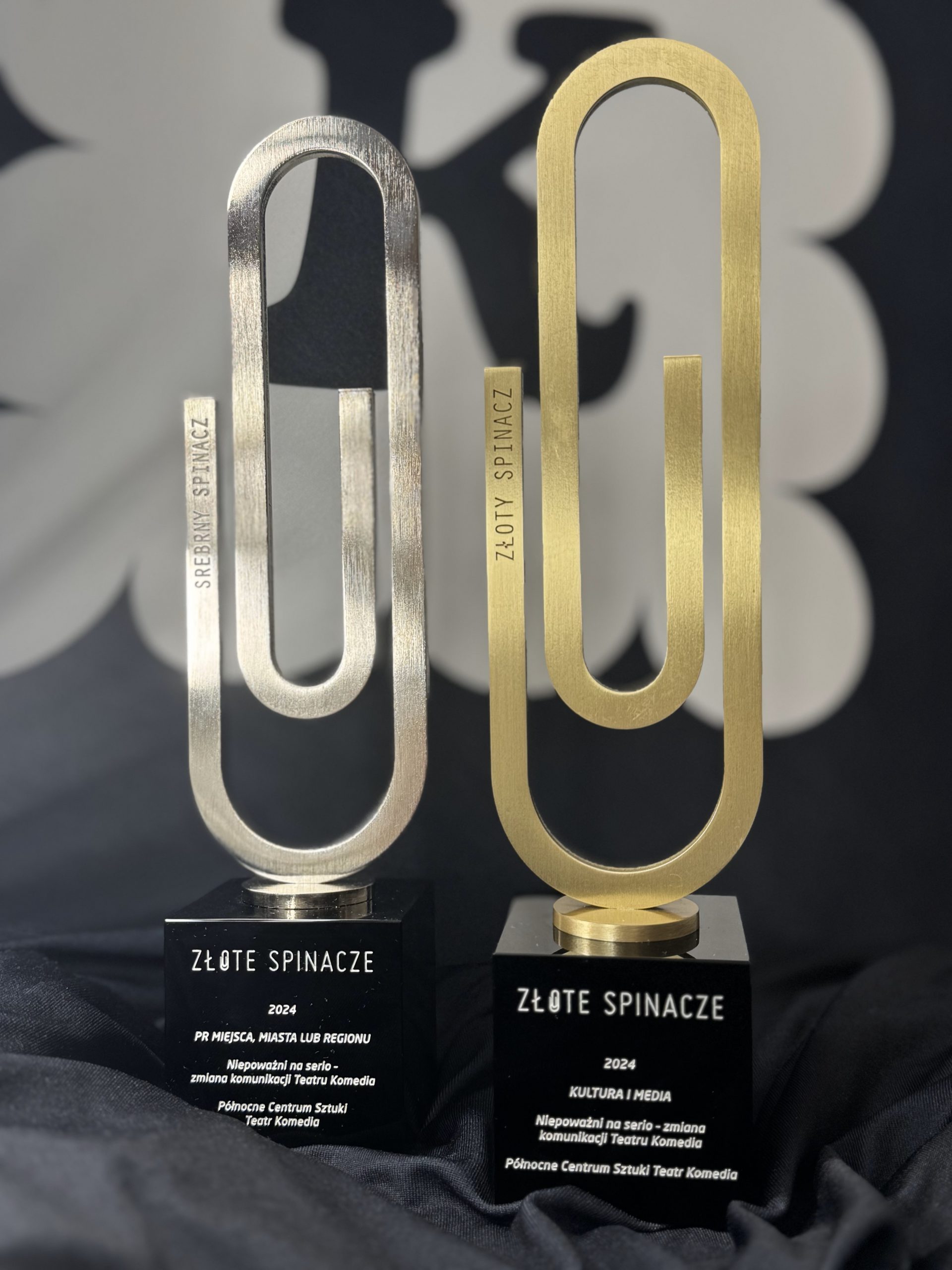 Teatr Komedia został wyróżniony Złotym i Srebrnym Spinaczem za zmianę identyfikacji wizualnej oraz komunikacji z publicznością. W kategorii „PR miejsca, miasta lub regionu” (Srebrny Spinacz) byliśmy nominowani razem z projektami „LODZ600 – 600 obrazów na 600-lecie Łodzi” oraz wystawą Zamku Królewskiego na Wawelu, a w kategorii „Kultura i media” (Złoty Spinacz) wspólnie z Havas PR/Canal+, 24/7Communication/TikTok Polska oraz Stowarzyszeniem Filmowców Polskich.
