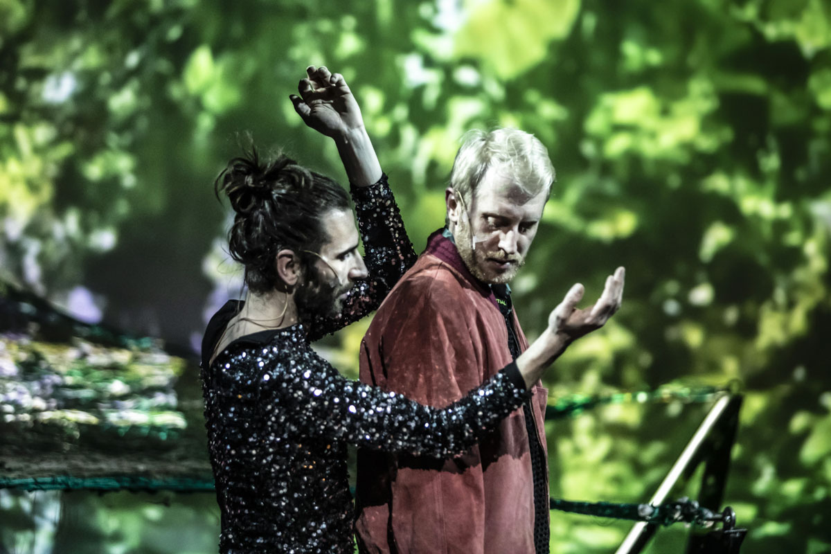 Spektakl hipnotyzuje od pierwszych chwil. Na środku sceny ustawiono ciekawą konstrukcję przypominającą hamak, trampolinę, pajęczynę i sieci rybackie. Gdy widzowie zasiadają na swoich miejscach, z przysłoniętej półprzezroczystymi płótnami sceny spogląda w ich kierunku postać (Monika Frajczyk), która tworzy kolejne sploty sieci. Gdy wreszcie pozostali aktorzy pojawiają się na scenie, w energetycznym tańcu (świetna choreografia Pawła Sakowicza) kolejno wymieniają plagi, z którymi ludzkość musiała się dotychczas mierzyć, by wreszcie nastały lepsze czasy. Odtąd życie może toczyć się niespiesznym rytmem w zgodzie z odbudowującą się naturą.