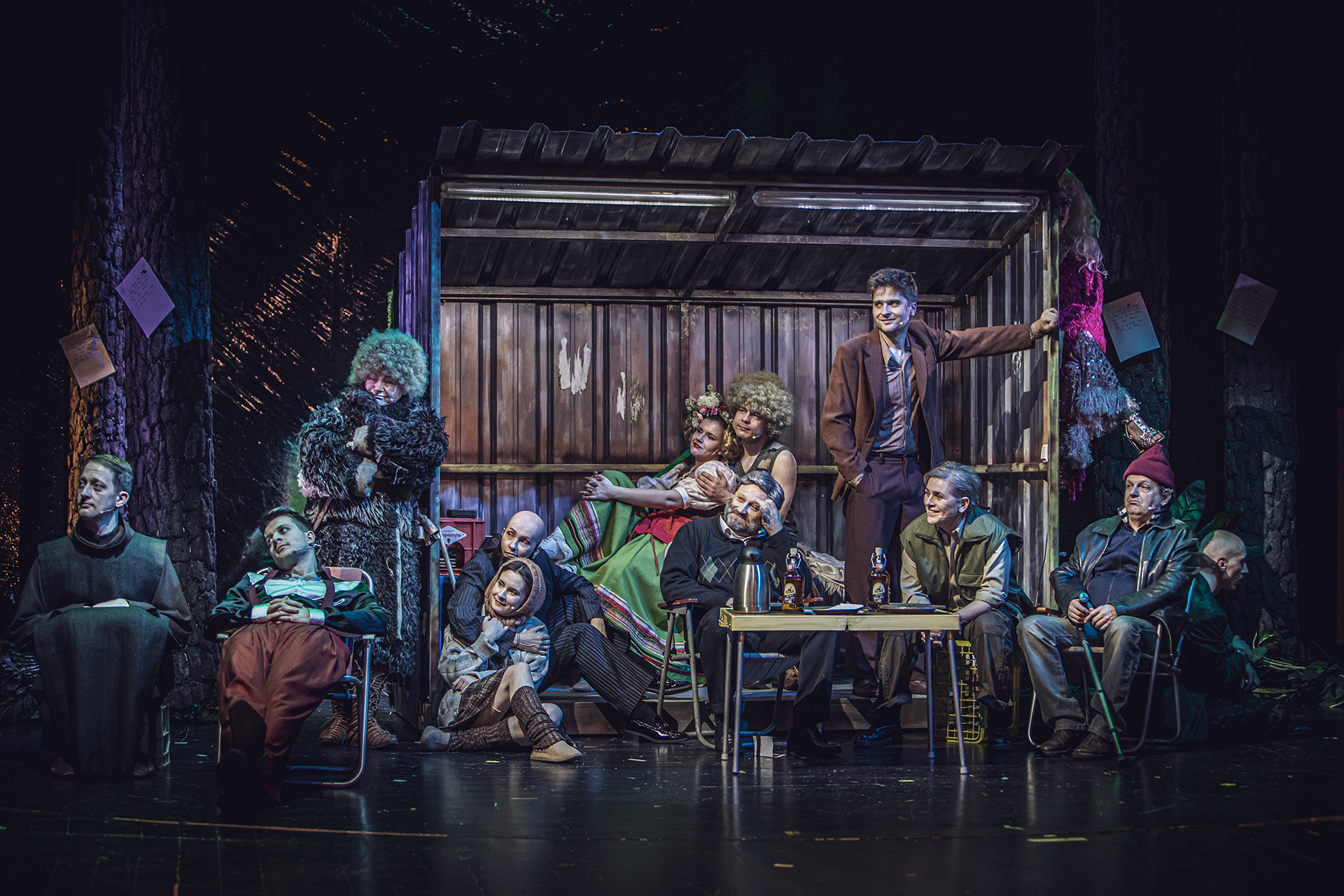 Sięgnięcie po formę musicalu okazało się strzałem w dziesiątkę, bo i sam temat, i okoliczności przyrody ku temu idealne. Pośrodku ardeńskiego lasu, w którym przebywa wygnany książę (Jan Nosal) stoi wiata, przypominająca zdezelowany przystanek PKS-u z lat 90. W jej otoczeniu toczy się życie koczowników-wygnańców, dobrze odnajdujących się wśród pasterzy, owiec (cudowne kostiumy Marty Śniosek-Masacz) i leśnych zwierząt. Zanim jednak do sielskiego królestwa dotrze Rozalinda (Marta Stalmierska) i Celia (Maria Chojnacka) obie Panie czekają nie lada perypetie. Na co warto zwrócić uwagę, kuzynki są bardzo wyrazistymi postaciami, kobietami z silnymi osobowościami (dużo mocniejszymi niż w literackim pierwowzorze).