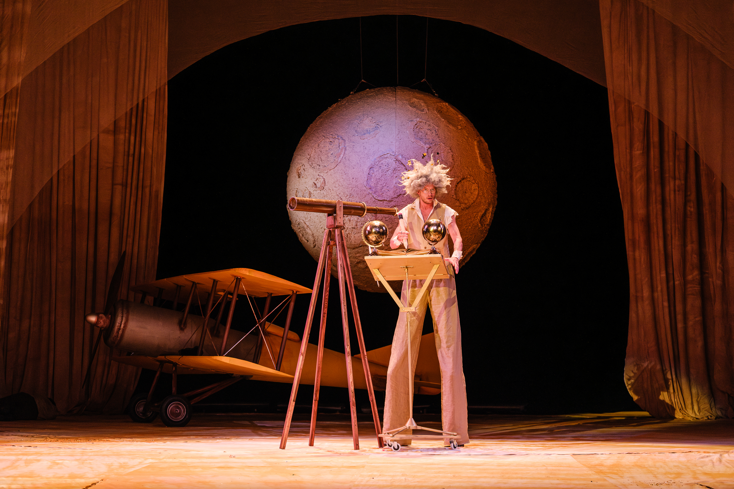 31 maja na Dużej Scenie premiera spektaklu „Mały Książę” (reżyseria, adaptacja, teksty piosenek Cezary Domagała) od razu zaskoczyła widzów. Podniesiona kurtyna odsłoniła realnych rozmiarów dwupłatowiec, stanowiący nie tylko element scenografii, ale i symbol podróży oraz samotności Pilota. Imponujących rozmiarów planeta, umieszczona centralnie, sprawnie pozwalała na płynne przechodzenie między kolejnymi miejscami, w których rozgrywały się losy Małego Księcia. Natomiast materiały imitujące pustynię dopełniły całości, tworząc sugestywną wizualnie przestrzeń .To rozwiązanie, za które odpowiada Natalia Kołodziej (scenografia i kostiumy), już na wejściu wzbudziło podziw. Niesamowita była obserwacja zarówno dzieci, jak i dorosłych, którzy z urzeczeniem patrzyli na ten obraz.
