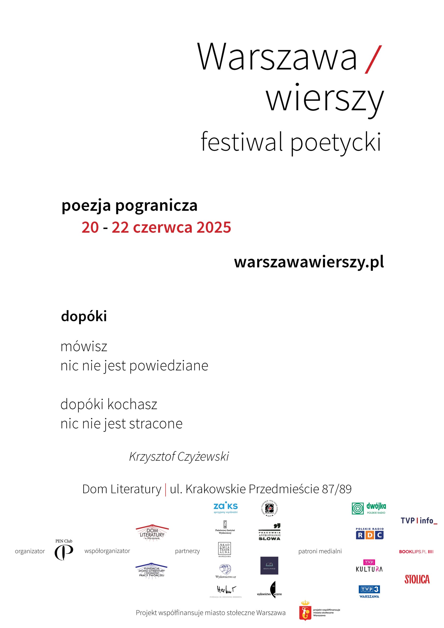 Patronat medialny: Polskie Radio PR 2, Polskie Radio RDC, TVP Kultura, TVP Warszawa, TVP Info, Booklips.pl, Magazyn “Stolica”.