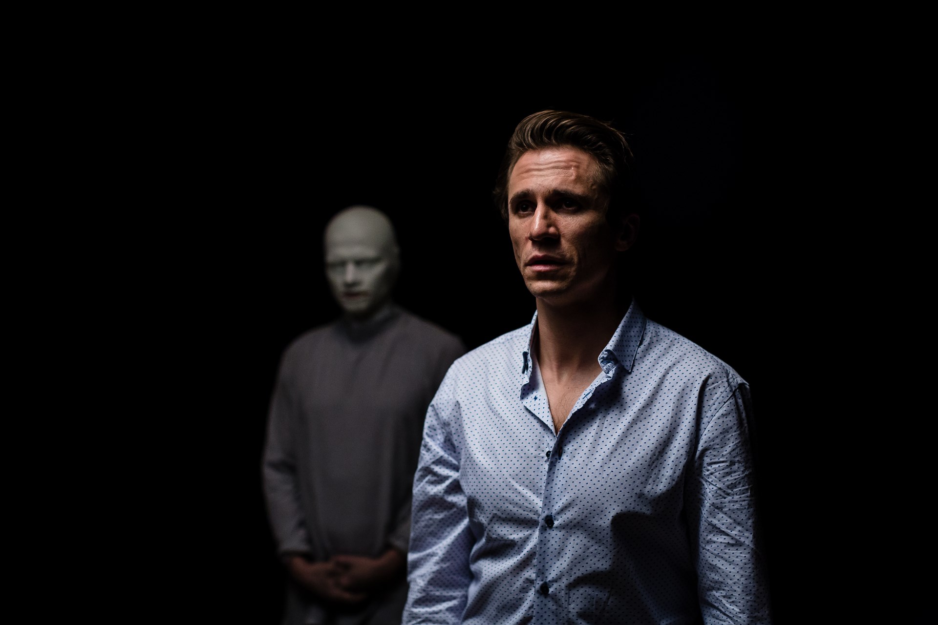 Bohater sztuki, niejaki Rafał Aletyński (Sambor Czarnota), jest szefem firmy prowadzącej sprzedaż internetową. Jak mówi, sprzedaje złudzenia, oferując klientom podróbki znanych marek za połowę niższą niż w przypadku oryginałów cenę. Nie widzi on w swojej działalności niczego zdrożnego, co stara się wytłumaczyć swojemu pracownikowi (Sebastian Stankiewicz) podczas kompletnie oderwanych od realiów rozmów z nim (lepszy byłby zwykły dialog, bez wykonywania przez Piotra pompek czy stawania na baczność). Metody manipulacyjne Rafał stosuje wobec innych. Dotyczy to Bianki, pracownicy banku (Marta Chyczewska), która może przekonać zarząd, by udzielił naszemu bohaterowi kredytu; Moniki, żony Rafała (Marzena Bergmann), którą ten stara się przekonać o swojej wierności, a gdy prawda wychodzi na jaw, prosi o drugą szansę, bo tak wypada, tak się robi w danej sytuacji. I tylko swojego organizmu Rafał nie potrafi okłamać: mężczyzna mdleje wtedy, gdy kłamie. Bohater jest zdziwiony, bowiem według niego „tylko dzięki umiejętnemu omijaniu tej tak zwanej prawdy, jesteśmy w stanie budować wspólne wartości”. Podejmuje w tej sprawie dialog ze Śmiercią (Sylwia Karczmarczyk) i tytułowym człowiekiem bez twarzy, a właściwie człowiekiem w masce (Przemysław Wasilkowski). Czy refleksja nad dotychczasowym życiem w kłamstwie przyniesie oczekiwany efekt? Odpowiedź na to pytanie autor – reżyser zawiesza w próżni.