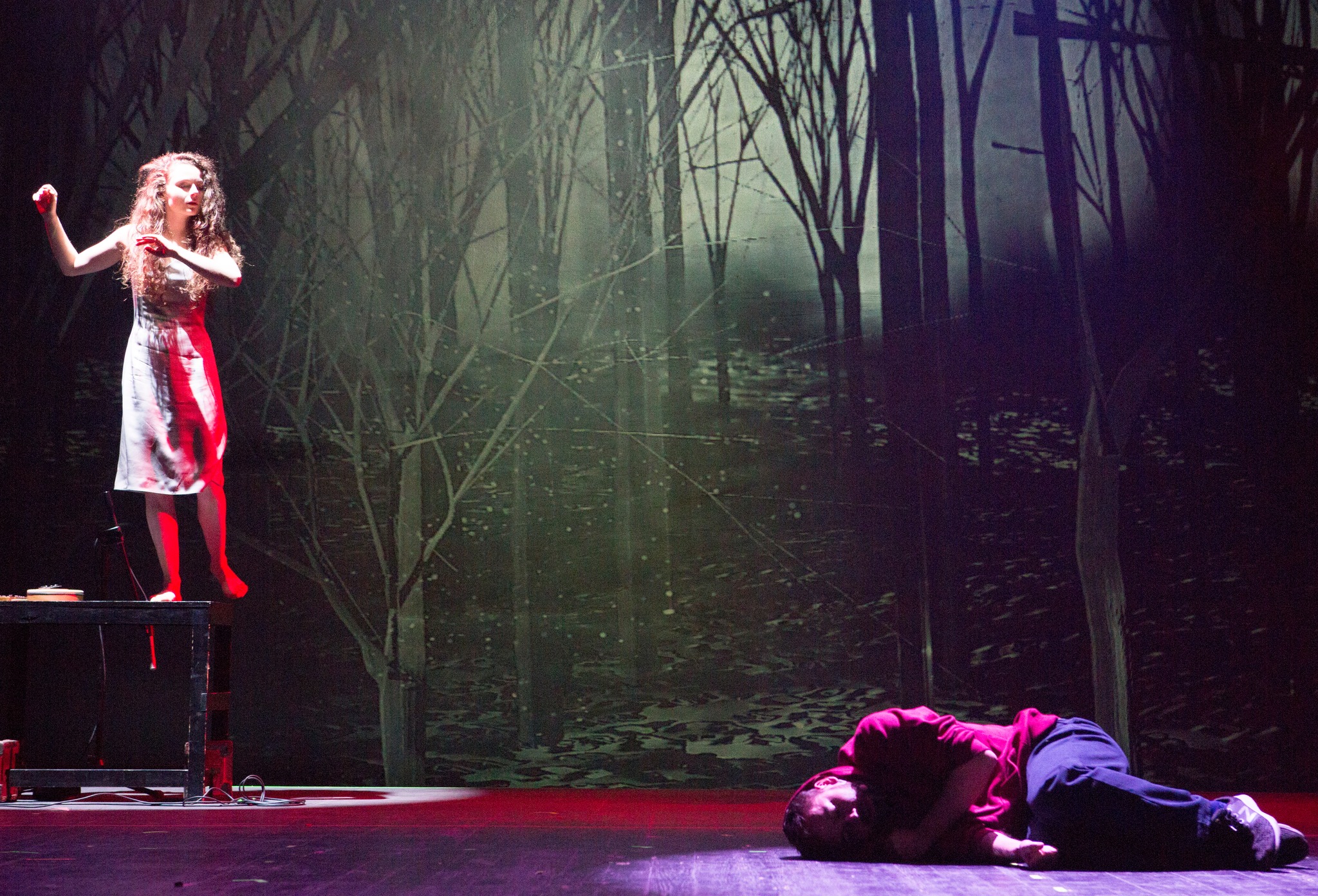 W poetycko wysmakowanym spektaklu z powodzeniem wykorzystano różne konwencje sceniczne. Jarosław Kilian po mistrzowsku oddaje niezwykły klimat poważnej, filozoficznej opowieści, łącząc przy tym kilka technik teatralnych – samo przedstawienie grane jest w planie aktorskim i lalkowym. Marionetki ożywają w rękach animujących je aktorów i nabierają charakteru. W spektaklu nie zabrakło też epizodu rodem z teatru cieni – trzy alegoryczne bestie (u Dantego były to lew, pantera i wilczyca) pobudzą wyobraźnię i trochę straszą. Cienie zdają się groźne i nie chcą wypuścić bohatera z leśnych gąszczy, jednak można je pokonać. Aby wydostać się z ciemności, zagubiony w mroku Dante musi zaufać Wergiliuszowi i z jego pomocą odbyć długą, pouczającą podróż. Jakub Mieszała w roli Dantego, zwykłego człowieka kierującego się i sercem i rozumem, od razu budzi sympatię. Aktor wprawnie, z widoczną energią kreśli psychologiczny portret postaci, podkreślając niuanse cech osobowości oraz wątpliwości i niepokoje targające bohaterem. Wraz z nim widz wędruje przez niebezpieczne krainy w zaświatach, poznając kolejne bestie i grzeszników cierpiących za swe winy w Piekle oraz rzeszę pokutujących w Czyśćcu nieszczęśników. Historia Paola i Franceski wzrusza, ale daje też okazję do myślenia. Jej znaczenie, czyli niebezpieczeństwo ulegania burzliwym namiętnościom czy wiodącym na manowce „kudłatym myślom”, doskonale przekazują Wojciech Pałęcki i Beata Duda-Perzyna. Na scenie obserwujemy jednocześnie pięknie wykonane lalki i aktorów-animatorów, dzięki którym Paola i Francesko potrafią wyrażać swe uczucia, stają się realni, nabierają wyrazistości. Przemyślenia i wyjaśnienia homeryckiego bohatera, żądnego wiedzy Odyseusza, początkowo mogą budzić wątpliwości, ale ostatecznie trudno się z nimi nie zgodzić. Grzegorz Feluś w tej roli jest zarówno zabawny, jak i – gdy to konieczne – pełen gniewnej powagi. Podróż przez mroczną gęstwinę toczy się dalej, a Dante próbuje zrozumieć, czemu czyśćcowe dusze muszą przeżywać ból? Widzi je pokutujące za opieszałość, opilstwo, nadmierne lenistwo i obojętność wobec zła, wysłuchuje skarg i wyjaśnień. Co ważne – rozmawia też o wolnej woli. Cały czas toczy dysputy ze swym mistrzem i duchowym przewodnikiem, Wergiliuszem, bez którego nie mógłby „wyjść z ciemnego lasu” ani też zrozumieć sensu wędrówki. Dante traktuje Wergiliusza jak swojego mistrza, słuchając jego nauk i objaśnień. W postać Wergiliusza wciela się śpiewak operowy, baryton Damian Wilma. To znakomity pomysł, by rzymskiego poetę zagrał śpiewak, którego dźwięczny, silny głos i wdzięczna ballada pomagają niedoświadczonemu, zabłąkanemu wędrowcowi przejść przez Piekło i Czyściec, dodają otuchy, objaśniają sens przygód i przywracają wiarę we własne siły. Damian Wilma rzetelnie oddaje charakter granej postaci, jego pieśń uczy i chroni oraz pomaga w zwątpieniu.  W pewnym momencie musi zostawić Dantego, ale wie, że zagubiony poeta poradzi sobie sam. W Raju czeka na Dantego ukochana, nieżyjąca już Beatrice – w tej roli Hanna Turnau. Piękne, liryczne sceny są niezwykle ujmujące, urzekają delikatnością, lekkością i uczuciowością. Całą przestrzeń wypełnia hymn na cześć miłości, wzajemnego szacunku i zrozumienia. W spektaklu baśniowość, magia, fantazja z elementami grozy mieszają się z mitem, a także licznymi odniesieniami do współczesności. Nawet trudniejsze alegorie, bogata symbolika są czytelne i nie przytłaczają dzięki sugestywnej konstrukcji spektaklu. Reżyser zgrabnie łączy bogactwo środków i treści – muzykę, plastyczne, wciąż zmieniające się obrazy i projekcje.