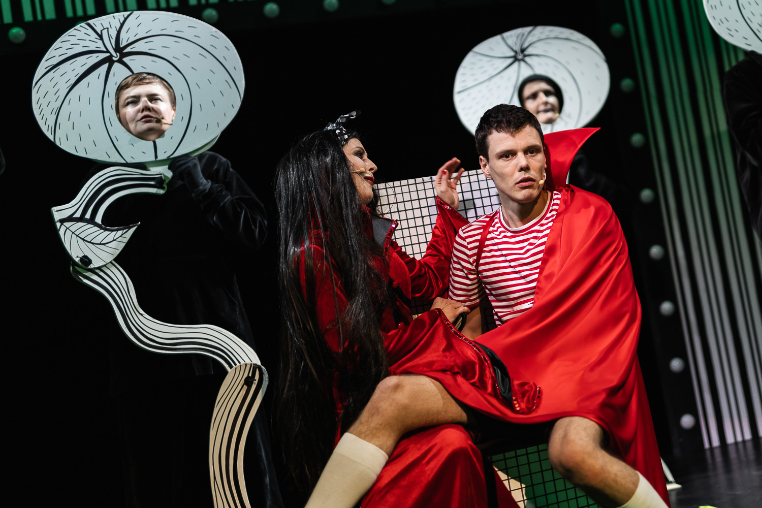 Dobrze myślicie, jeśli kojarzycie ten tytuł z serią „Poczytaj ze mną” wydawnictwa Egmont. Marcin Wicha, grafik i autor książek dla dzieci, pokusił się o przepisanie na teatralny scenariusz swojej książki o przygodach wampira, który zamiast straszyć woli rozśmieszać kolegów. Swoje poczucie estetyki i znajomość teatralnego rzemiosła dołożył czeski reżyser i scenograf Marek Zákostelecký, który od lat chętnie pracuje z polskimi zespołami. Wyszła bardzo udana współpraca. Narodził się z niej spektakl z pogranicza musicalu, komedii i… kina grozy.