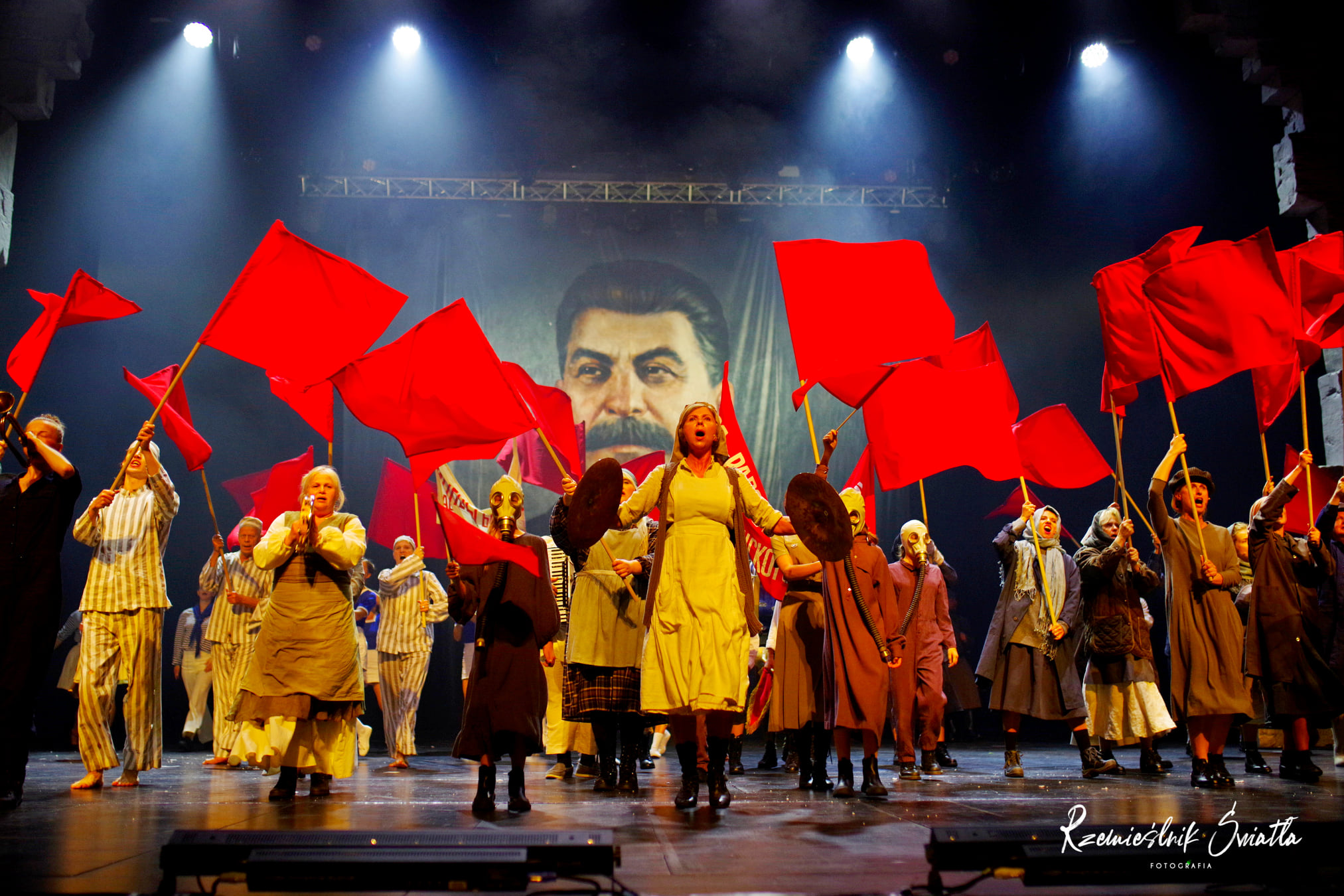 Wyraźniejszy niż na trzy powieściowe światy, staje się podział na dwa akty, między którymi zachodzi jakościowa przepaść. Spektakl rozpoczyna się całkiem obiecująco. Twórcze rozterki Mistrza, przesłuchiwanie Jeszui przez Poncjusza Piłata, maszerujący w takt “Międzynarodówki” przedstawiciele narodu rosyjskiego – dzięki obrotowej scenie i wykorzystaniu kilku kurtyn możliwe są szybkie zmiany scenografii przygotowanej przez Andrzeja Worona. Choć nie jestem fanką wprowadzanych na scenę kartonowych i styropianowych makiet, nie można odmówić dekoracjom efektowności, a raczej efekciarstwa. Proste, ale bardzo symboliczne rekwizyty oraz kostiumy autorstwa Klaudii Filipiak nie tylko pomagają identyfikować miejsca akcji, ale również budują odpowiedni charakter spektaklu. W pierwszej części inscenizacji sprawnie i dynamicznie przenosimy się z miejsca na miejsce, sceny rozgrywane są w odpowiednim rytmie. Partytura wykonywana przez orkiestrę pod batutą Dariusza Różankiewicza brzmi znakomicie, choć żadna z piosenek Andrzeja Poniedzielskiego nie wpada w ucho.