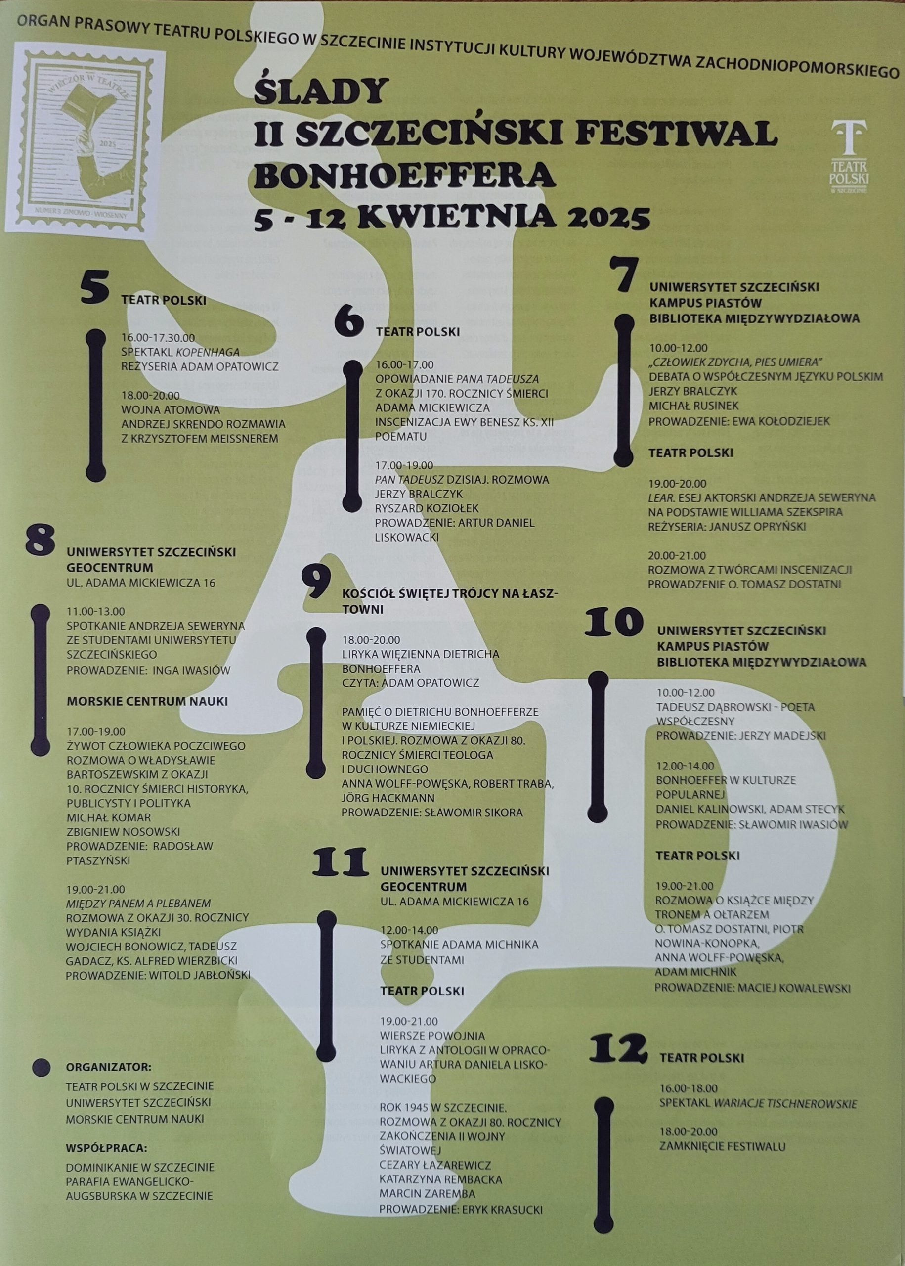 – zapowiedź i program II Szczecińskiego Festiwalu Bonhoeffera „ŚLADY”, który odbędzie się w kwietniu w Teatrze Polskim (zaplanowane są spektakle, w tym premierowy pt. „Kopenhaga”, jak też debaty i spotkania z udziałem m.in. Adama Michnika, Andrzeja Seweryna, Michała Rusinka, Jerzego Bralczyka),
